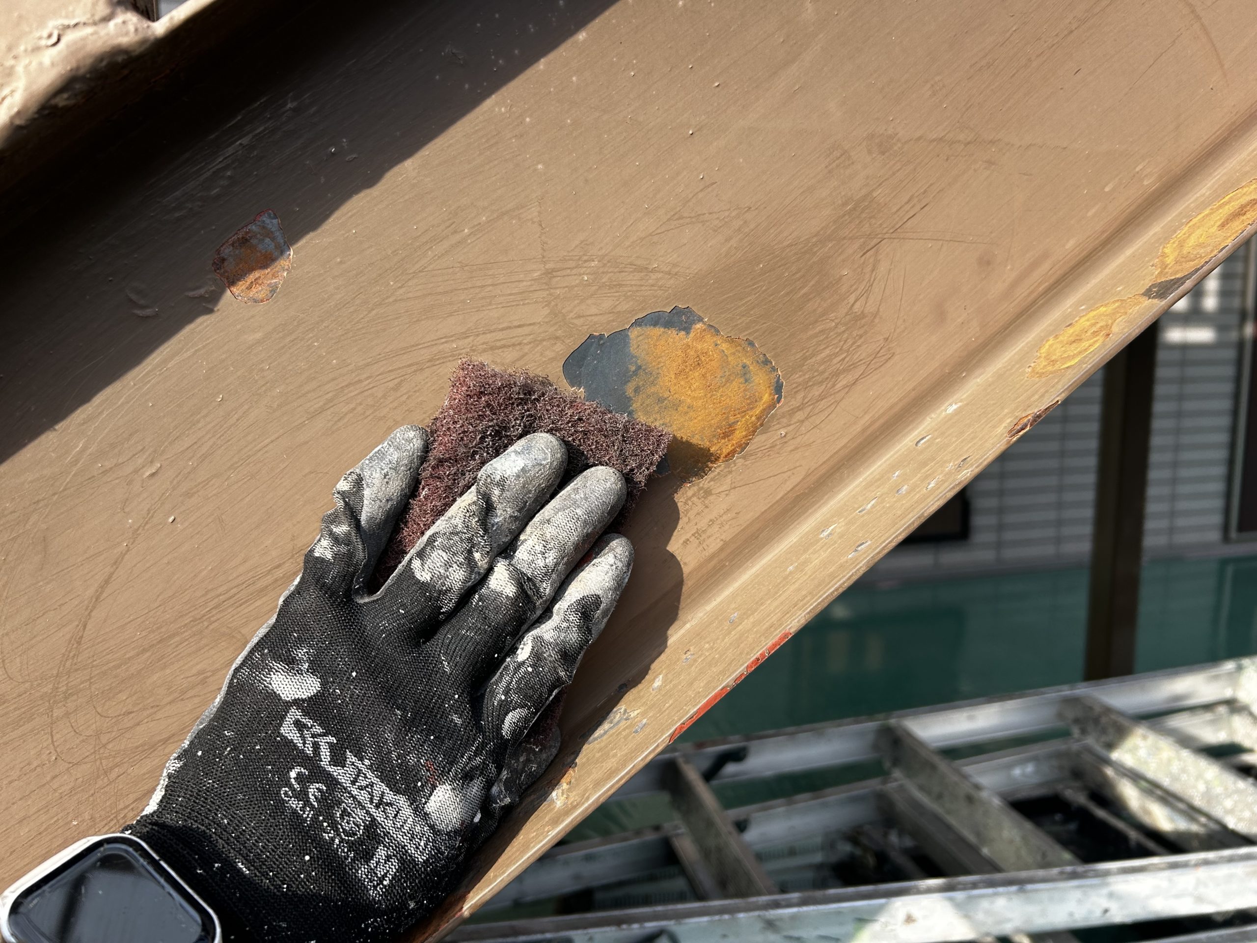 外部階段はサビが出やすいため、まずは丁寧なケレン作業で下地を整えます。使用している道具はカワスキと研磨布(マジックロン)で行います。